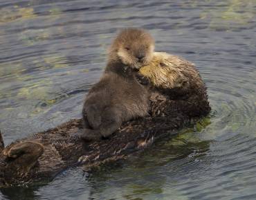 Newborn sea otters weigh 3 to 5 pounds. A sea otter pup’s fur traps so much air that they cannot dive underwater. When a mother leaves to go hunt for food, she will wrap her baby in kelp, leaving it to bob on the surface of the ocean like a cork. Mothers spend much of their time grooming their pups and are often observed carrying them on their chest.