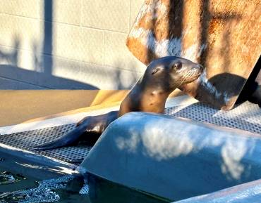 California sea lion Babymac was found in a parking lot – a dangerous spot far from where he should be. Luckily our trained responders were alerted through our hotline and, with help from our friends at the Mountain View Police Department, Babymac was rescued and transported to our Sausalito hospital.