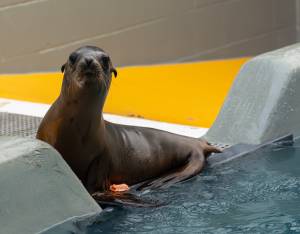This resilient pup continued to make slow but steady progress, eating small herring and occasional offers of anchovies and squid well on his own. Babymac started to gain weight and compete well with his pen mates – all encouraging signs of progressing toward returning home.